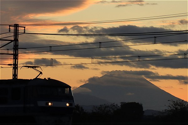 夕日は既に丹沢山系に沈んでしまったよう。富士山がオレンジ色を背景に浮かび上がって来た。